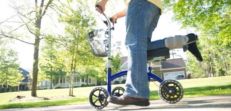 The knee scooter will give you your mobility back. Easy to use, easy to steer, and less painful than your crutches. Give your arms a rest and order one today for delivery. Knee scooters include brakes, front basket, padded knee rest, and is foldable for transport.